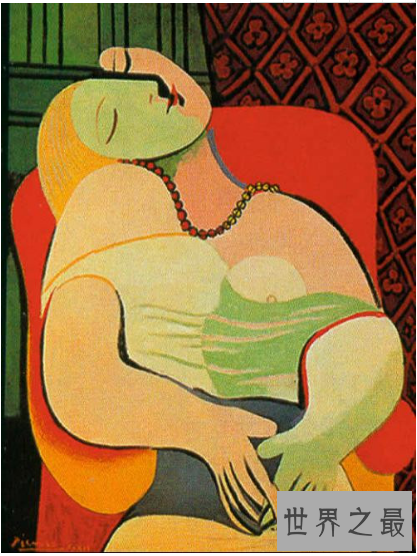 毕加索47岁的时候,遇到一个金发少女,这位少女后来成为了他的绘画和雕刻的模特儿,这是十大世界名画价值排行之一,是他对这个少女的爱的一种表现,画里面女人的面部表情安详,温柔,看得出她睡的好甜,但是女人的身体比例不是很协调,上半部分很窄,独特的画风给观者更多的想象的自由空间。