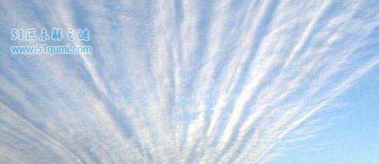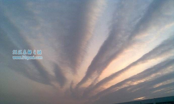 4、鱼鳞震云:由大块云团在几小时内产生的涣散成鱼鳞状的云团,多与“多条震云”共时涌现,云团深浅明显,现有见解以为浅的一端为震中,预见着2~6天此后的地动。