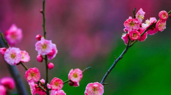 梅花是冬季最典型的观花树种,在寒冬也能正常开花,花期时间在冬春季节,开花时有浓郁的花香,花瓣的颜色有粉红色、枚红色、红色等多种颜色,点缀的风雪中。