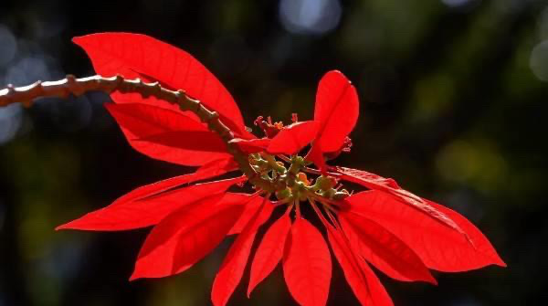 一品红是灌木植物,茎干直立生长,最高能长到4米,卵状椭圆形的叶片呼声,极少数叶片的边缘有波状浅裂,叶片的颜色是朱红色,花果期时间长,能从10月份持续到次年4月。