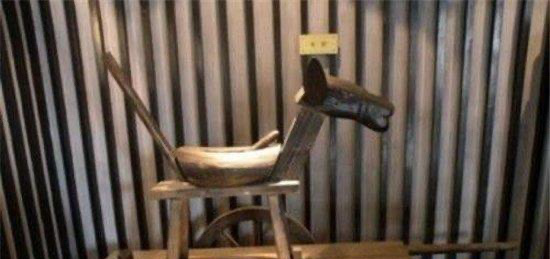 这是古时候惩治罪犯的一种刑法,大部分用在女人身上。要是那些谋害亲夫,或者是搞外遇的,通常被会使用骑木马驴。木马驴,实际上就是用木头做的类似于小木马的东西,然后中间竖着一个尖木桩。要是女犯犯案的话,会直接将她们坐在这根尖木桩上面,刺穿下身!