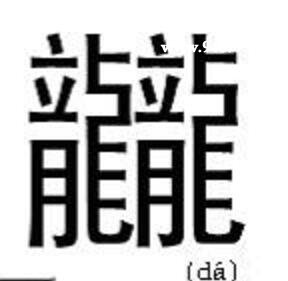 《汉语大字典》解释此字说:二龙、三龙均音dá,龙行貌。四龙音zhé,义为“唠唠叨叨,话多”,并认为四龙是“詟”的异体字。《说文言部》:“詟,一曰言不止也。”
