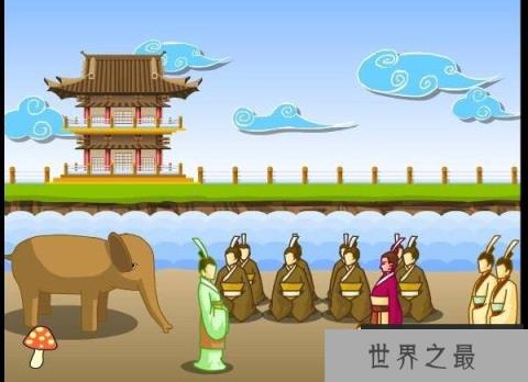 当时的曹冲只有5、6岁的样子,东吴的孙权给曹操送了一头大象,高兴不已的曹操带着文物百官和曹冲一起去观看这头奇特的动物。见到这头大象体型大得如此惊人,曹操突发奇想想知道这动物的重量是多少。在场的众官员纷纷提出了造大秤等的想法,甚至有人提出宰杀大象,然而都被一一否决了。就在曹操以为无计可施之时,自己的儿子曹冲站了出来,将乘着象的船身划上痕迹,再把象赶上来,替换成一块块石头,通过等重互换的方式知道了大象的重量。