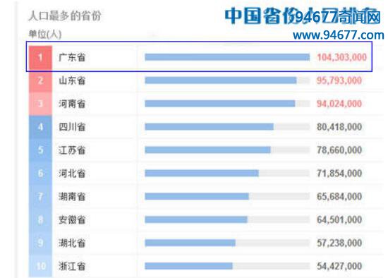 中国人口最多的省份,广东省为人口唯一过亿省份(1.04亿)