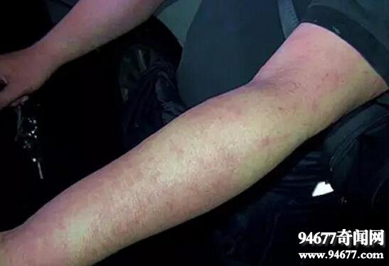 红火蚁不同于其他蚂蚁,被火蚁属的蚂蚁叮咬后会感觉像火烧一样灼痛,起烫伤一样的水泡,更严重的会引起过敏性休克甚至死亡,这就是火蚁名称的由来(此处不放受害者的图了,有兴趣自行搜索吧,密恐慎搜)。能引起这些反应,是因为火蚁腹部末端有连接毒腺的螯针,连续刺入皮肤,释放毒液引起过敏反应,毒性成分为水溶性毒蛋白。