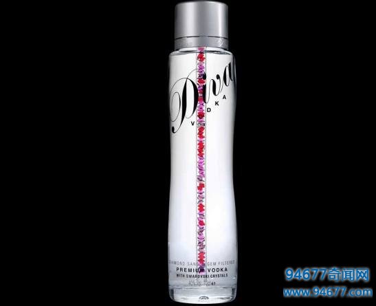 伏特加Diva,标价1000000美元 伏特加经过三重过滤,首先经过冰中过滤,然后是北欧桦树木炭过滤,最后是珍贵的宝石过滤。这使得此款伏特加酒身价大涨。不过,酒瓶中央贯穿的施华洛世奇水晶装饰才是此酒价格昂贵的主要原因。