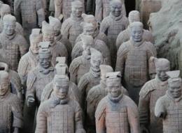 考古学家最终证实,秦始皇陵墓总共有8000多个真人大小的陶制兵马俑。在考察出土的兵马俑时,考古学家们吃惊地发现,这8000多名士兵的脸型,加上他们的头型和发型,恰好与10个汉字的形状相一致。这些汉字分别是:日、甲、由、申、用、自、目、风、田和国。奇怪的是,尽管来自西安的正式考古记录提供了汉字字符的名称,考古学家们却从未解释兵马俑脸型之谜的含义。