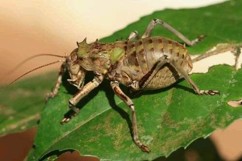 这种蟋蟀的名字,叫做披甲树螽,是一种主要生活在非洲的昆虫。披甲树螽的体型,比起普通的蟋蟀就要大上一些,最主要的便是它身上的“盔甲”,能够抵御天敌的进攻,而且让人意外的是,这种昆虫居然还会喷洒毒液,可见其凶猛程度了。