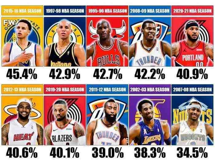 NBA10大得分狂人的最佳三分球命中率,库里无悬念排名第一