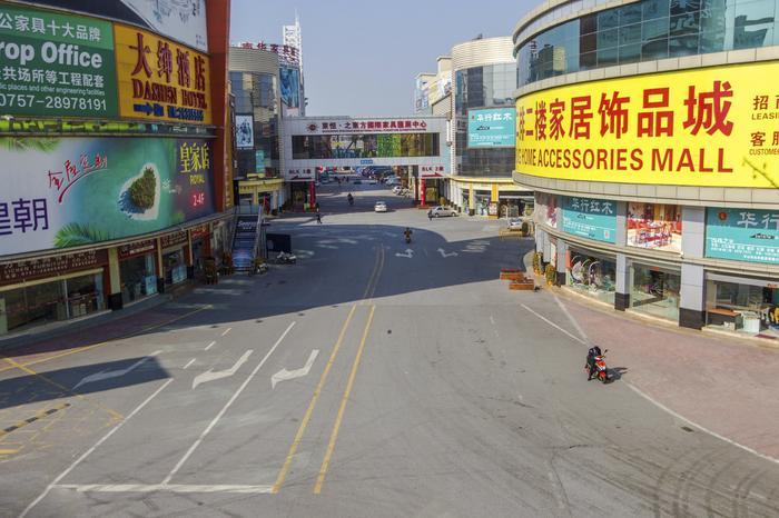 排名第二,号称世界工厂的东莞,工厂、商铺基本上都关门停止生产、营业,路上行人、车辆颇为稀少。