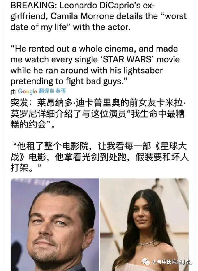 今年1月,小李子被曝出在和卡米拉约会时,竟然包场让女友看了一天的《星球大战》系列电影,让卡米拉吐槽“这是生命中最糟糕的约会”——“他在电影院包场,让我看每一部 《星球大战》电影。他拿着光剑到处跑,假装要和坏人打架。”