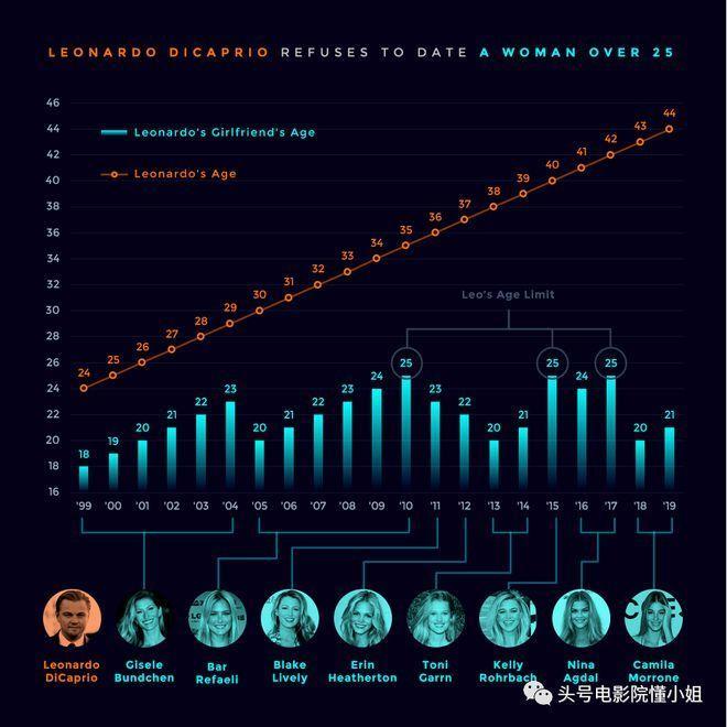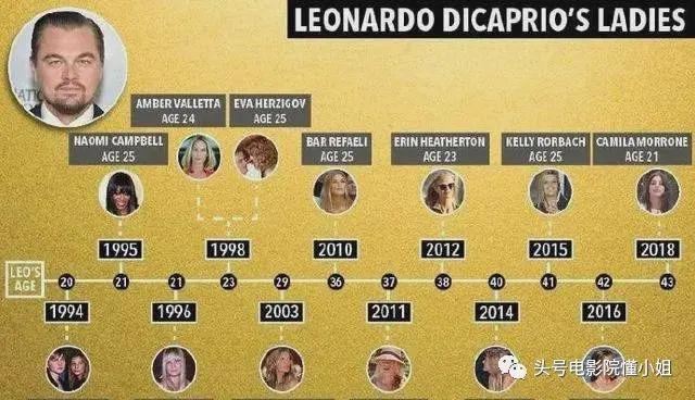 说起小李子的历任模特(女星)女友们,用这张图就可以一目了然,全部25岁以下,其中,交往最短的仅仅1个月,平均交往时间是5个月左右。