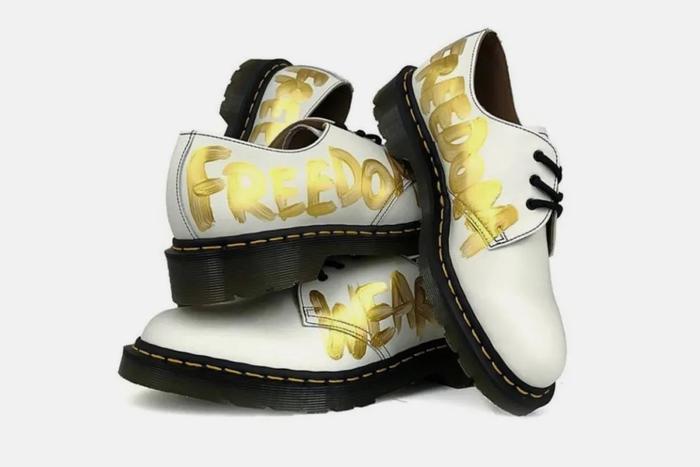 2018 年 COMME des GARÇONS 亦和 Dr.Martens 推出 1461 鞋款。采用白色皮革包覆鞋面,经典黄线缝合并辅以「WEAR YOUR FREEDOM」字样。