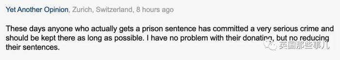 “现如今,能进监狱的人一般都是犯了严重的罪行,就应该尽可能多关他们一阵子。我对捐赠行为没有任何异议,但是减刑就别了吧。”