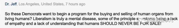 “所以,这些民主党人这是想开启一项买卖活人器官的项目吗?自由主义确实是一种精神疾病,其中一些主要症状是,缺乏同理心且不明白永远不应出售人类!”