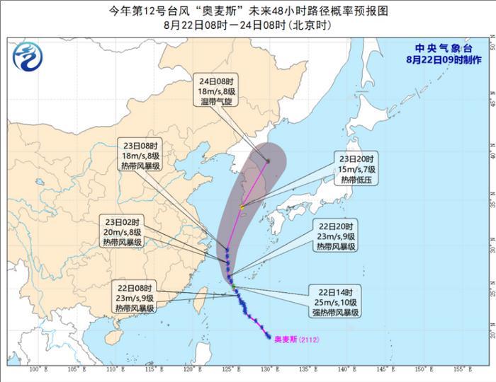预计“奥麦斯”将以每小时15公里的速度向北偏西方向移动,强度将有所加强,受其影响,今明天东海东部有9~10级阵风,台风中心经过的附近洋面有11级阵风。