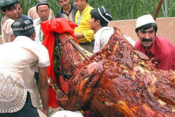 阿拉伯游牧民族在喜庆宴会时,常常用“烤骆驼”这道菜来招待嘉宾。这道菜大得惊人,由蛋、鱼、鸽子、鸡或鸭、羊、骆驼烘烤而成,堪称“世界上最大的硬菜”。在两个世纪前的摩洛哥就有着一个古老的传统习俗,那就是烤骆驼,当时他们的国王会宰杀骆驼烤熟后供国民食用,但是现在这个习俗已经逐渐失传,不过在07年的11月份,一位63岁的法国男子却在摩洛哥的首都凭借着烤骆驼创造了一项世界之最的记录。