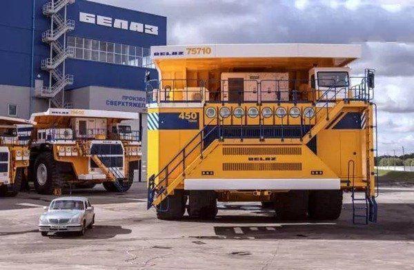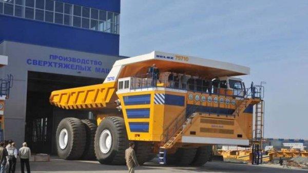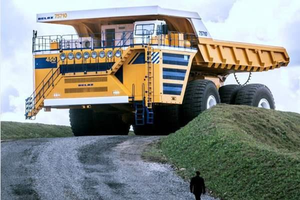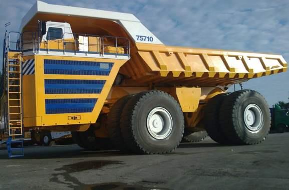 俄罗斯机械制造商别拉斯于2013推出75710型矿用卡车,它的出现一举将美国CATERPILLAR 797F从世界最大矿卡的宝座上拉下马。双轴的车架结构,配备8条轮胎,其载重量450吨,拥有4500马力,与西门子驱动系统相匹配,并配有两个2800升的油箱,简直是一台巨无霸!