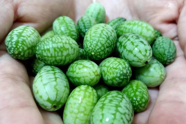 还有,老鼠瓜的外形也很奇葩,淡绿色的底色,加上深绿色的条状斑纹,像极了缩小版的西瓜,因此人们也习惯于将它称为拇指西瓜,实际上它的内部结构和口感都和黄瓜没有任何的差别,甚至科属和黄瓜也是一起的。