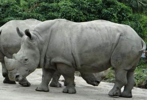 第三名:犀牛,是世界上最大的奇蹄目动物,异常粗笨的躯体,短柱般的四肢、庞大的头部,体长2.2-4.5米,肩高1.2-2米,体重2000-5000千克。是仅次于大象的陆生第二大动物。它致命的武器为长达一米的犀角。