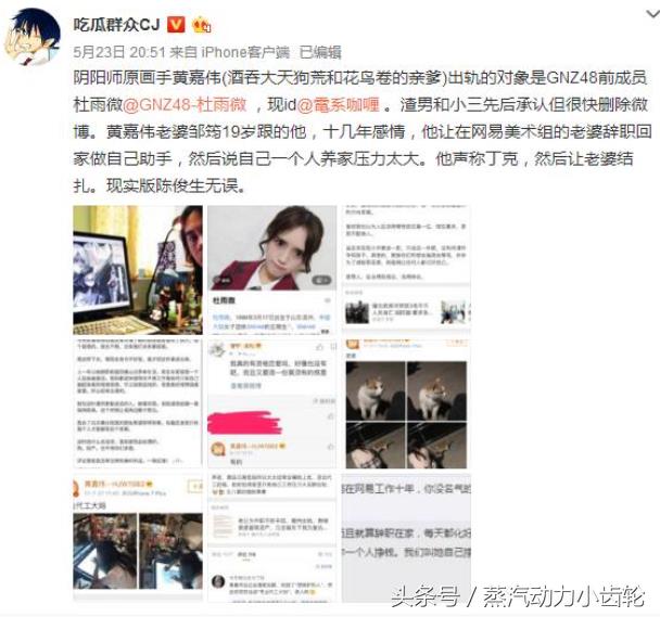 就在,网传黄嘉伟出轨某娱乐圈18线女团成员杜雨薇一度上了热搜。原来黄嘉伟跟老婆邹筠在19岁的时候就相恋了,一起走过了16年。在跟网易闹翻之后,黄嘉伟让老婆跟原工作组辞职回家当自己的助手,随后又称一个人养家压力很大,借酒消愁去网吧,之后遇到了小三就出轨了。一时间黄嘉伟湖鱥,黄嘉伟渣男的标签就上了新浪热搜,曝光微博转发量也超过了三万,随后黄嘉伟发微博洗白,但又因为承受不住大众的指责而删除。