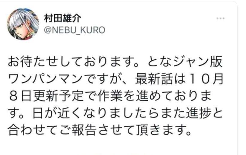 《一拳超人》194话一直迟迟没有更新,在经过漫长的等待后,村田老师终于发推确认10月8日更新,虽然还需要等待一周,但是起码有了时间不是?
