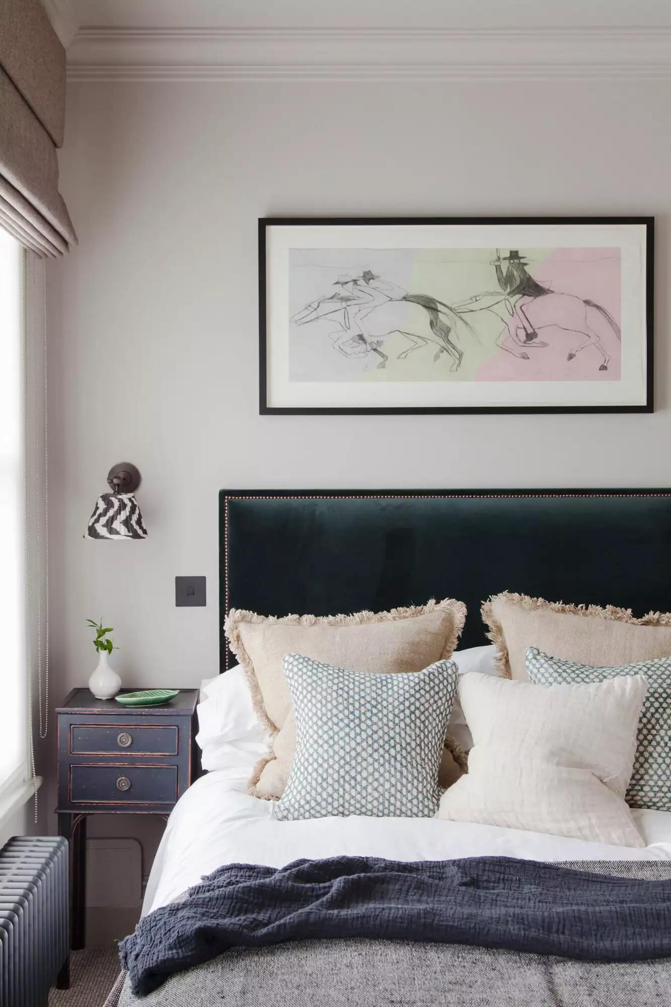 如上图中翡翠色床头与米黄色靠枕的搭配,用米黄色代替白色,可以起到柔化空间色调的作用。