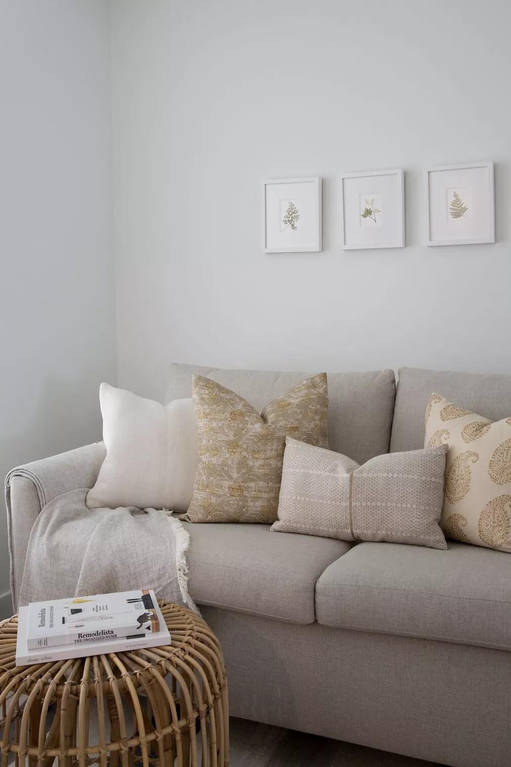 米黄色沙发、带有玉米黄色点缀的靠垫