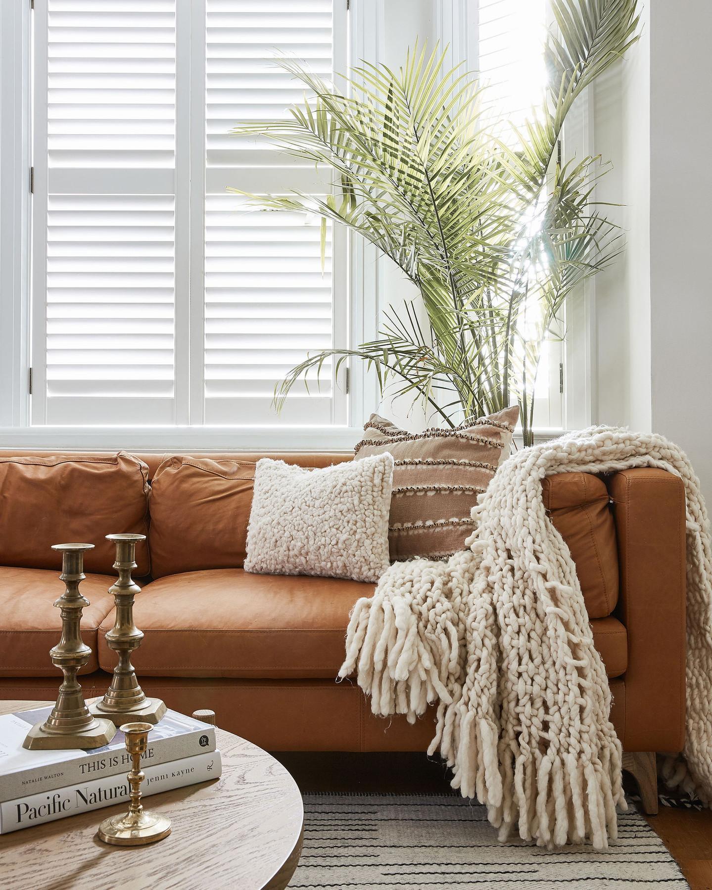 焦糖色的皮沙发、米黄色枕头、米色毛毯