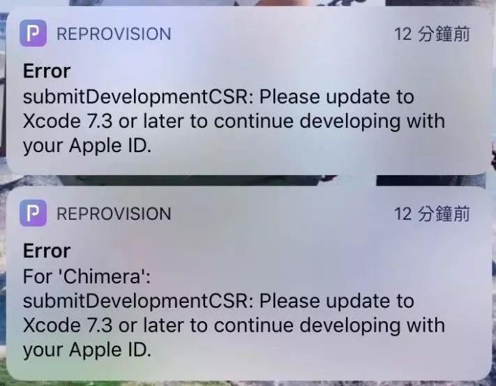 在2019年11月7日,苹果更改了服务器内容,导致中断了 ReProvision 续签运行,一旦续签,就会弹报错,提示:“升级到 Xcode 7.3.....”,导致续签失败,如下图: