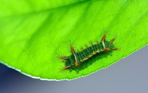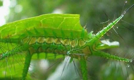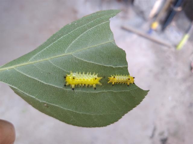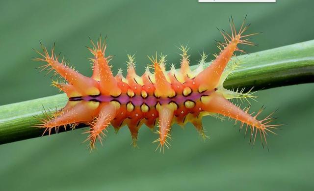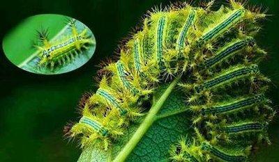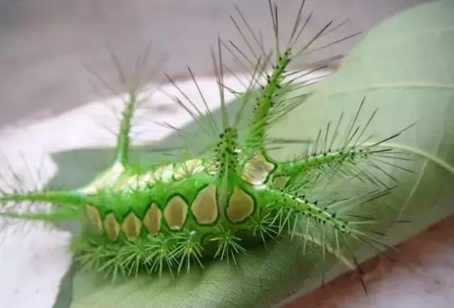 活辣子,成虫一般在1--4厘米左右,黄绿相间,看起来很像孩子们眼中的“糖宝”,认识的人都避之不及,身体有拇指粗,头部跟尾部大小差不多,各有四个角,角上布满白色细长的毛刺,这也是活辣子的防御武器,碰到它就会把毛刺竖立起来,刺伤到皮肤,会火辣辣的钻心的疼。