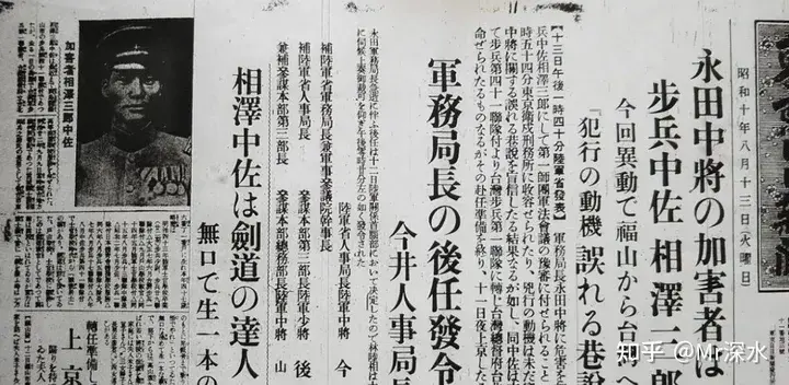 1935年8月12日,隶属于统制派的永田铁山在自己的办公室里,被隶属于皇道派的军人相泽三郎当场砍死,史称“相泽事件”,并间接引发了次年的“二二六兵变”