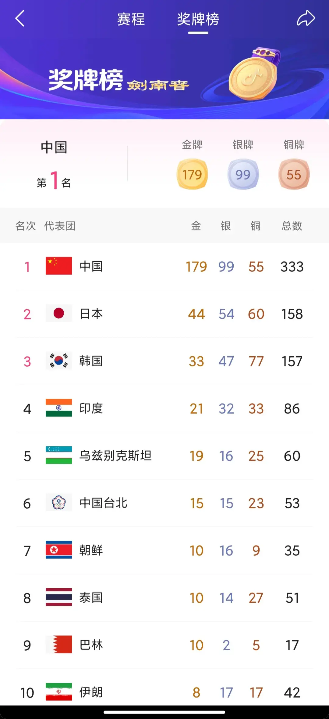 亚运会最新奖牌榜:中国队摘得333枚奖牌霸榜第一