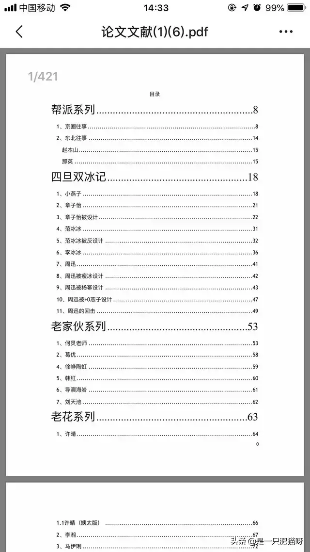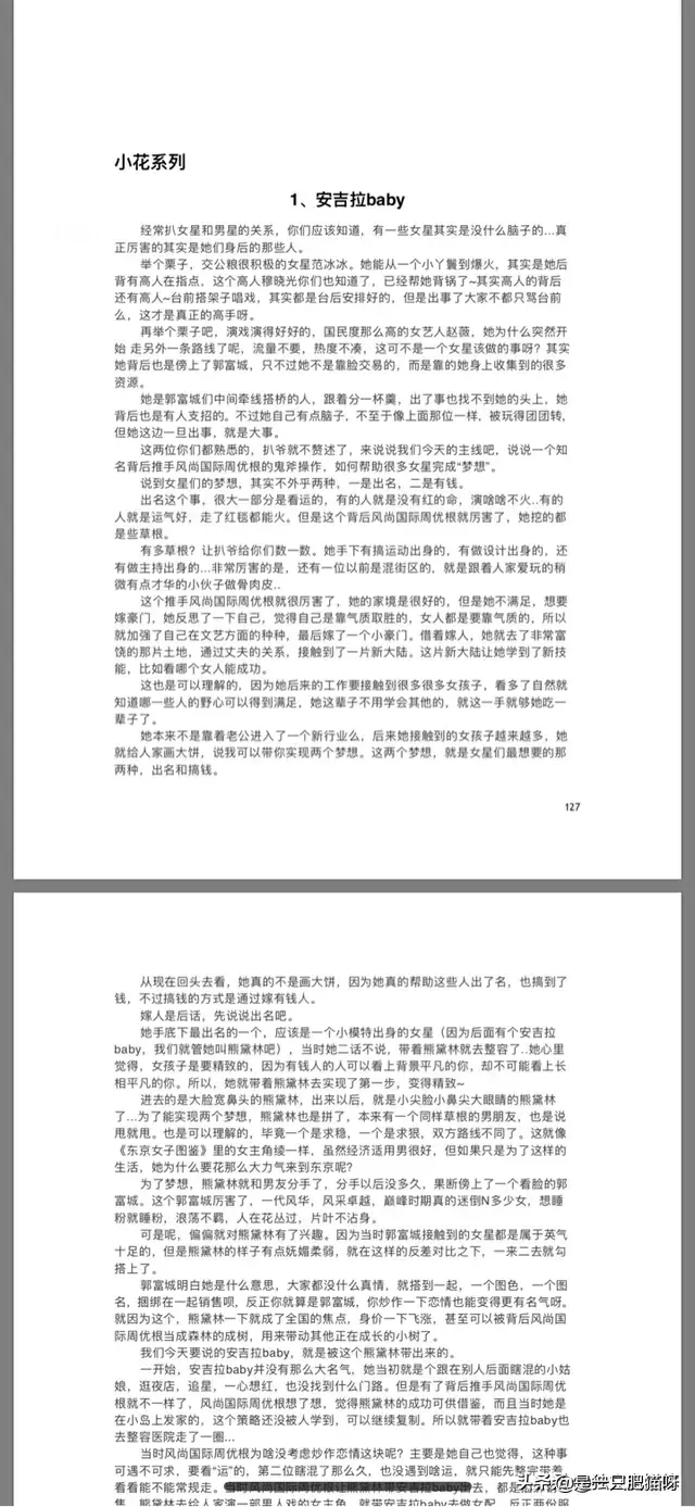 最近微博上出现了一个421页的PDF,据说这是一位大学生的毕业论文,这篇长达421页的论文讲的全是娱乐圈的八卦,很多网友都凑到一起要吃瓜,论文中几乎都是娱乐圈的黑历史,这让不少网友都怀疑那些见不得人的绯闻都是真的,论文中出现的明星不仅有平时绯闻就比较多的那些人,像是海岩、赵宝刚、刘亦菲等一直给人正面影响的圈中人也都不幸上榜。