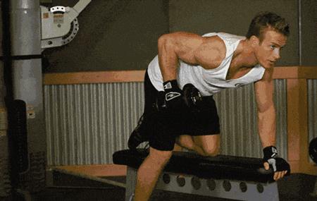 在这个练习中,你可以使用一个加重的哑铃或者一个加重的杠铃。躺在长凳上,把重量举过肩膀。将手向前额放下,肘部成90度角。将手臂伸展至起始位置。重复这个动作。