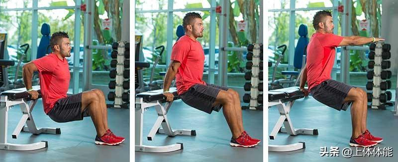 坐在长凳上,手掌放在臀部旁边,手指朝下。这个姿势用弯曲的膝盖比直腿更容易。从长凳上抬起你的臀部,把身体放低到肘部弯曲90度的位置。将手臂伸回到起始位置。一旦你的手臂伸展,用你的右手越过身体中线。躯干开始旋转,这样你就训练了你的核心。左臂会稳定下来。将右手放回中间,换手,然后将左手伸过身体中线。这既是一个孤立的练习,也是一个等距的练习。