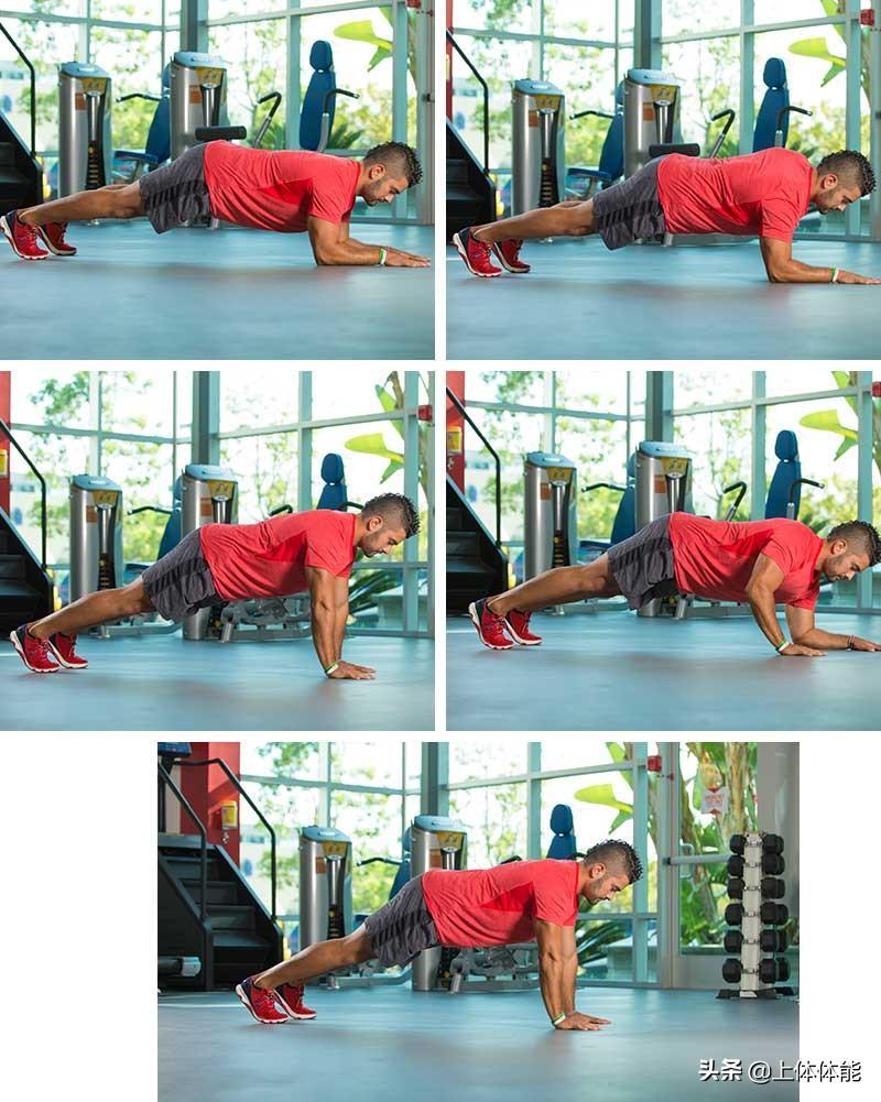 假设一个平板支撑,双手平放在地板上,双脚分开与肩同宽 。将右手放在地上,就像你通常做平板支撑一样。保持这个姿势四秒钟。接下来,把左手放在地板上,这样手由肘撑进入手掌撑。将右手前臂放在地上,保持这个姿势4秒钟。将左前臂放回地面。重复这种模式,交替使用手肘撑地手臂。