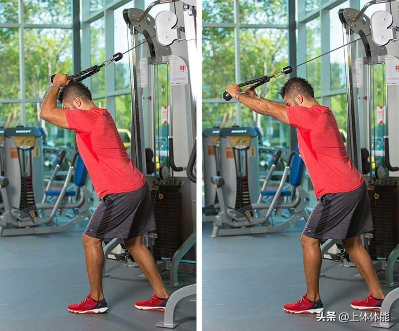 首先调整缆绳的高度和重量。双脚前后分开站立,从臀部稍微向前弯曲,这样你可以保持中立的脊柱。把绳子举过头顶,保持肘部弯曲。伸展肘部,在双臂伸展时分开绳子。回到原点,重复这个动作。