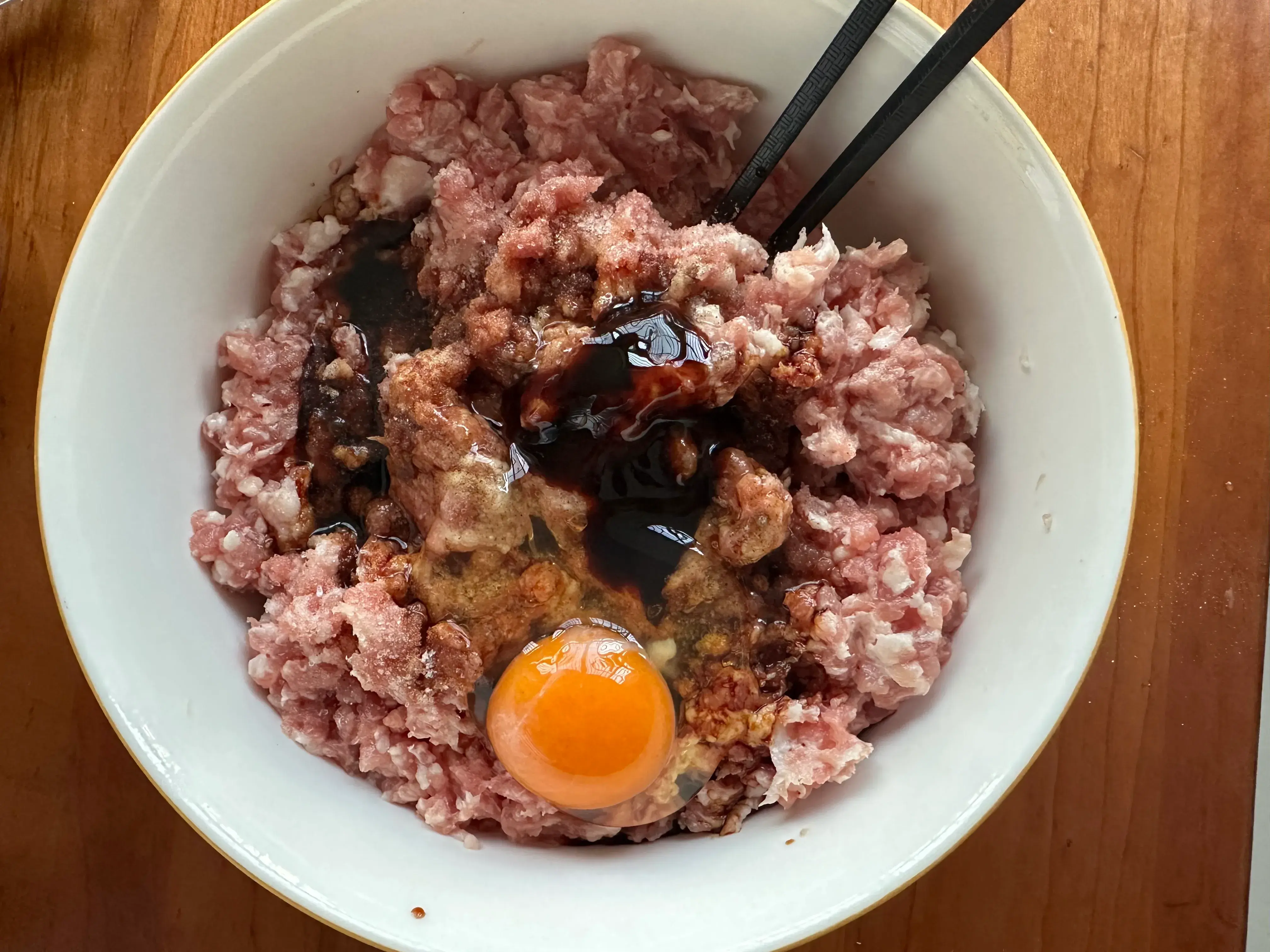 1、肉馅儿提前绞好,加入2勺老,2勺生抽、白胡椒粉、盐、蚝油,磕入一个鸡蛋;