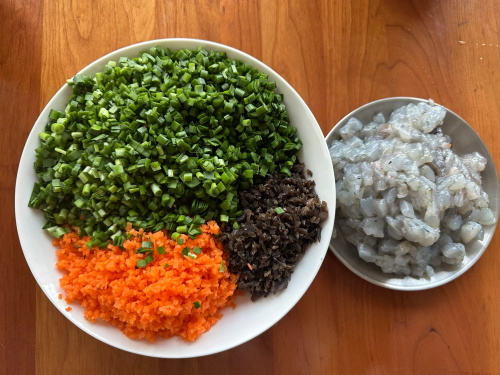 3、新鲜的虾仁切成大颗粒,蔬菜三鲜我用了韭菜、胡萝卜、木耳;