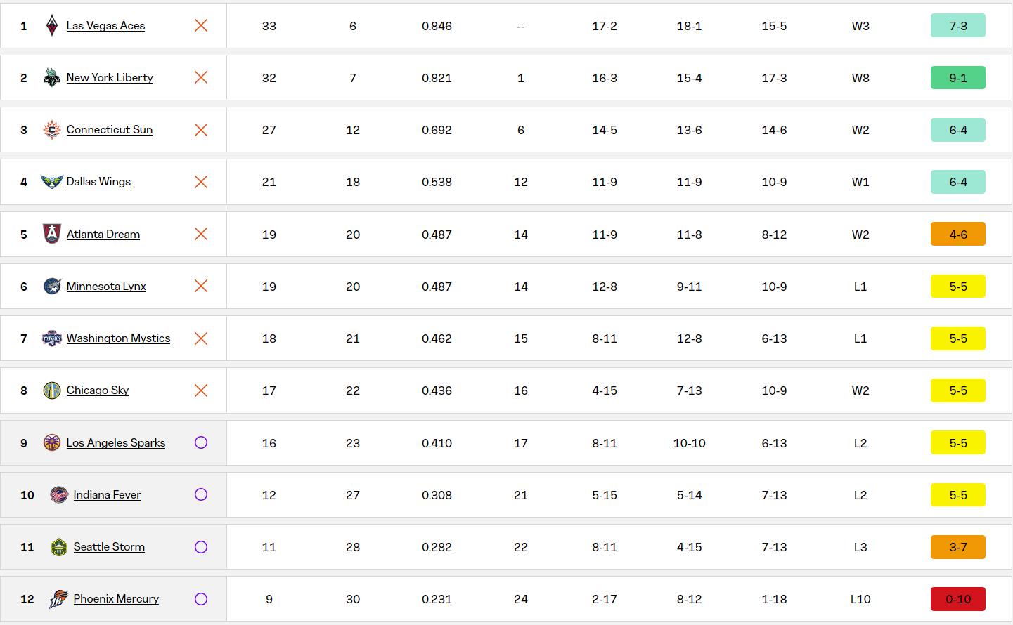 不知不觉,WNBA已经来到了最后一轮常规赛了。wnba在经历了三年疫情之后,本赛季常规赛扩大到了40轮,季后赛也是历史上首次全部采取5局3胜的形式,并采用2-2-1的比赛模式,排名高的球队拥有主场优势,看来wnba的影响力在其国内和世界各地越来越大。