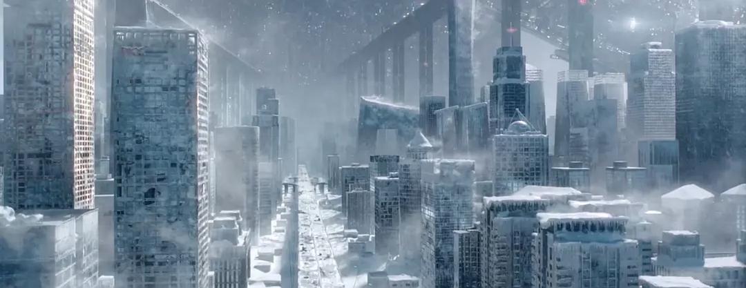 画面质感上——整部电影呈现出蓝调的高级感,不管是北京的“大裤衩”,还是上海的东方明珠,都在大自然的力量下被冰封,是一种接近绝望的荒凉之感。