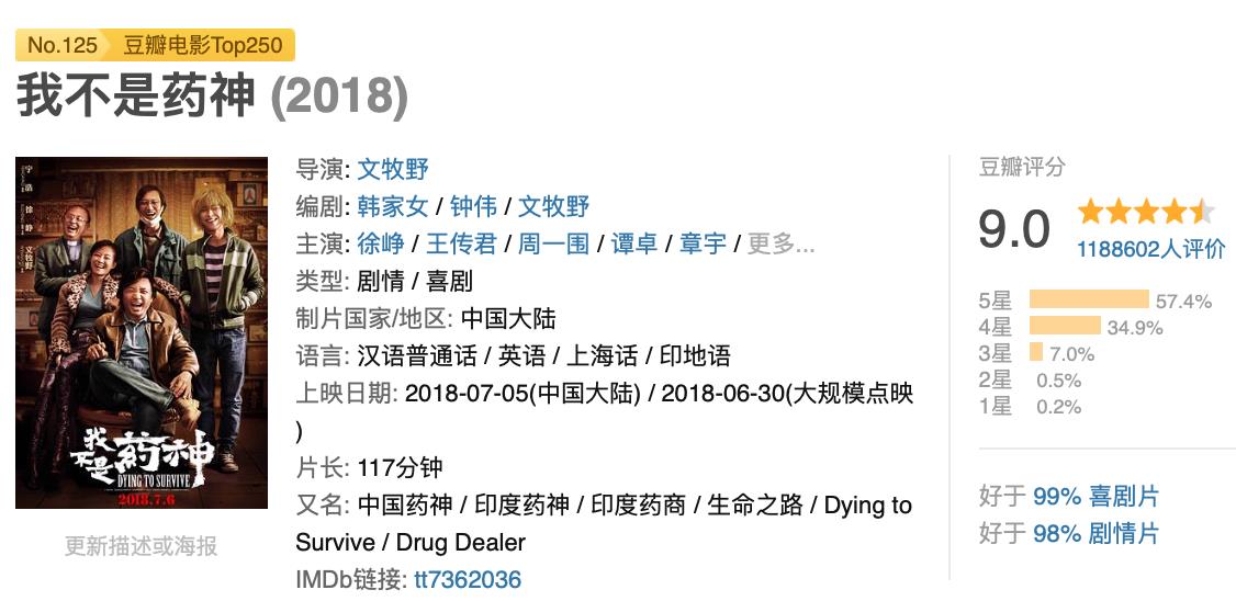 经过明晃晃的对比,可以看出,《我不是药神》可以真的是国影之光,不仅冲进豆瓣门槛贼高的Top250,同样在票房方面保持领先地位。