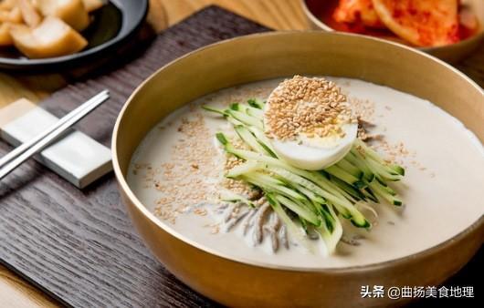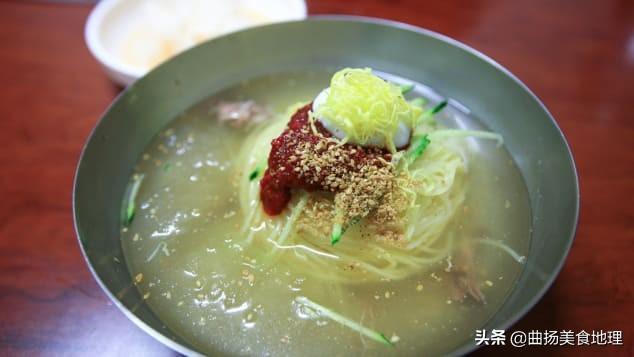 冷面来自朝鲜的平壤,由荞麦面条和味道浓烈的肉或泡菜汤组成,上面放着萝卜片、黄瓜和鸡蛋,再加上醋和芥末调味。