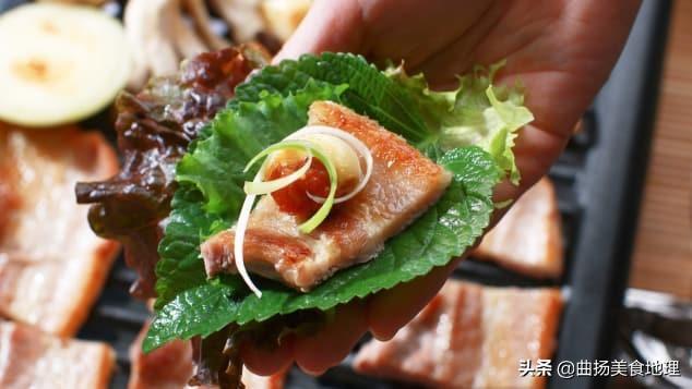 它与生菜、紫苏叶、洋葱片和生蒜泡菜一起食用,在大酱、苦椒酱或芝麻油中加入盐和胡椒粉。