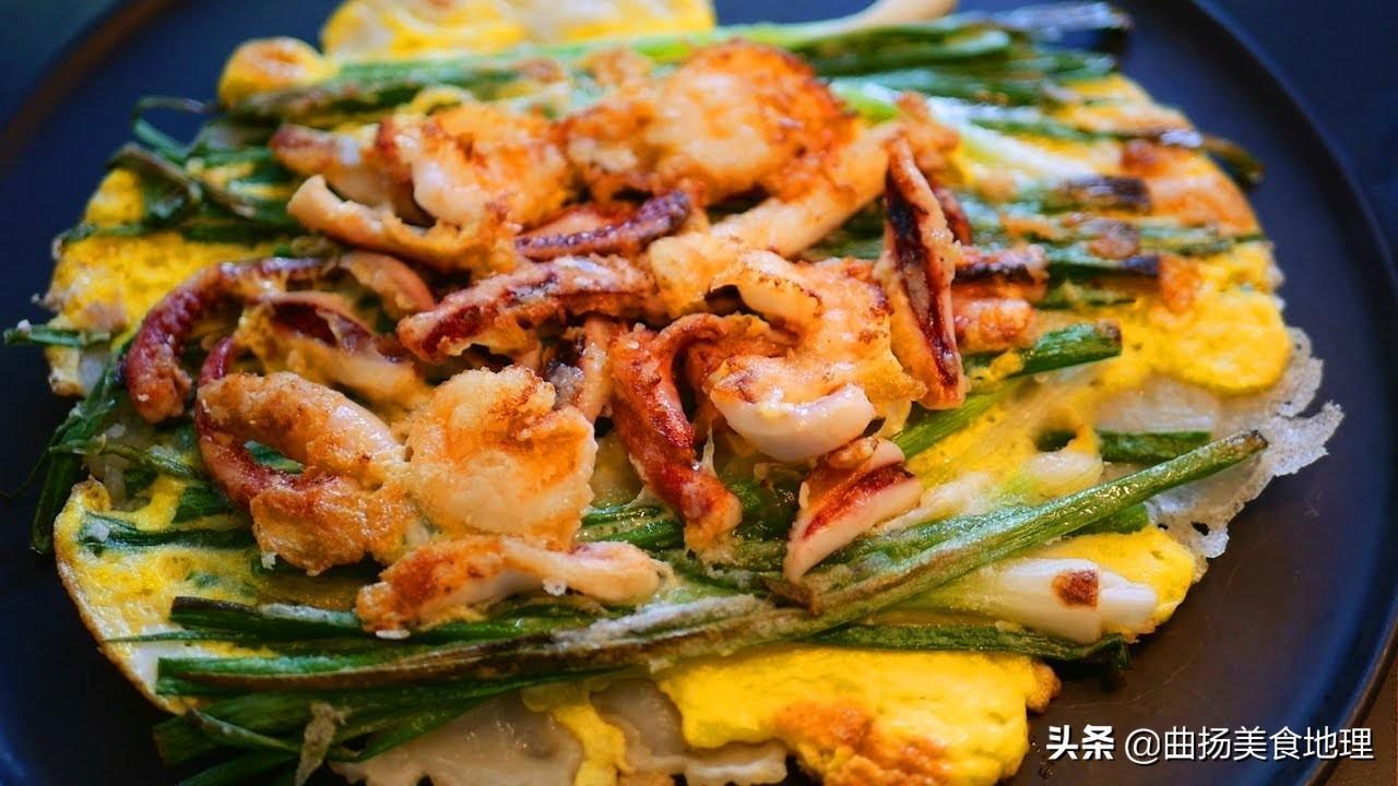 韩国煎饼口感酥脆,馅料丰富,配上贝类、墨鱼和其他各种海鲜,味道最佳。