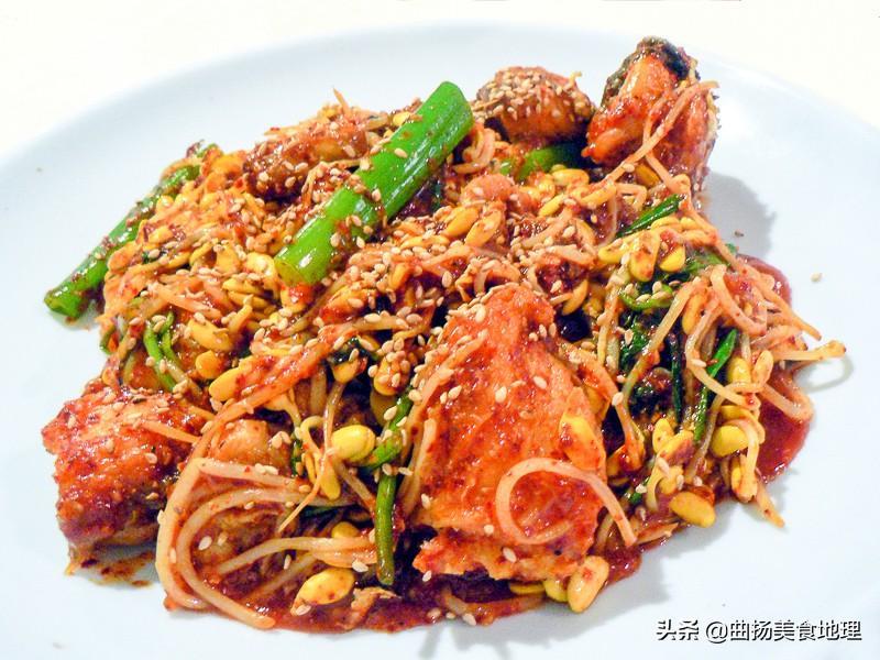 在这道菜中,大块的鸡肉浸泡在辣椒酱和其他香料的酱汁中,然后在一个大锅里与柚子、卷心菜、胡萝卜和红薯片一起翻炒。