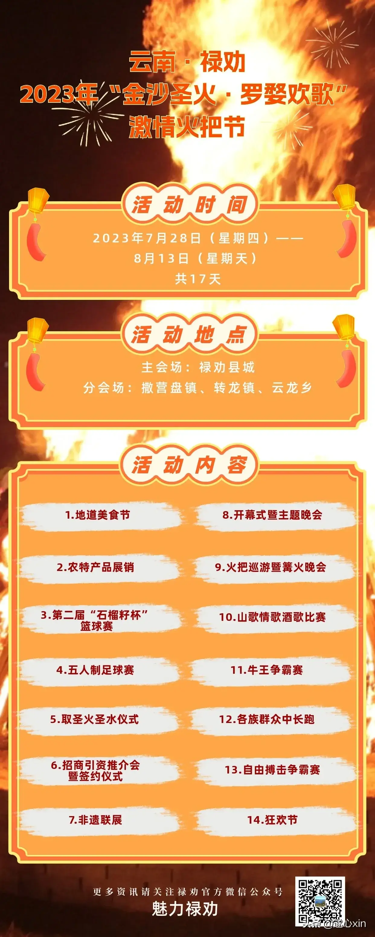 云南·禄劝“金沙圣火·罗婺欢歌”激情火把节2023年活动于7月28日揭开神秘面纱,火把巡游、篝火晚会、山歌情歌酒歌比赛等系列活动将闪亮登场。