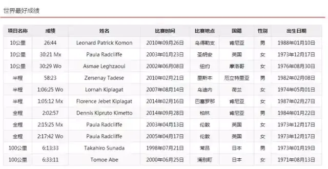 中国马拉松官网公布的各项马拉松世界最好成绩
