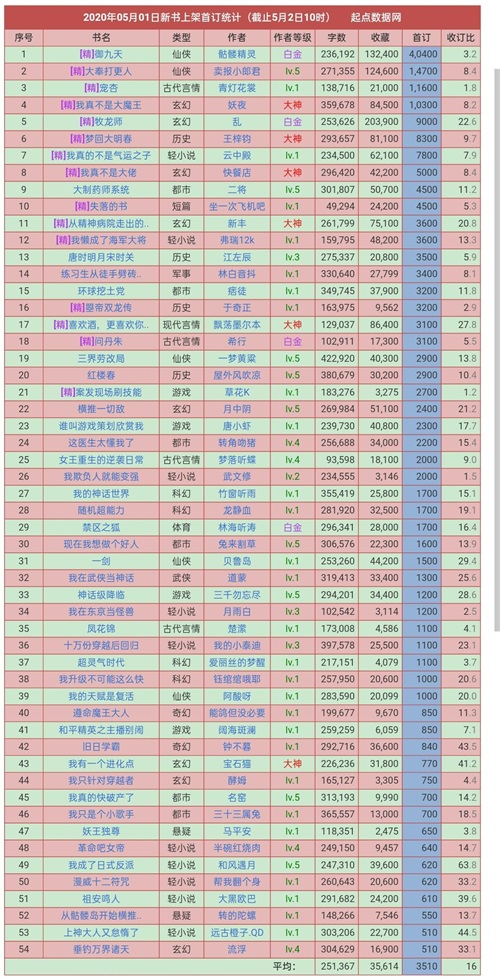 话不多说了,先来看一下整体数据:2020年5月1日累计上架新书1101本,其中:首订3000以上共十八位作者,1000~2999的共21位。